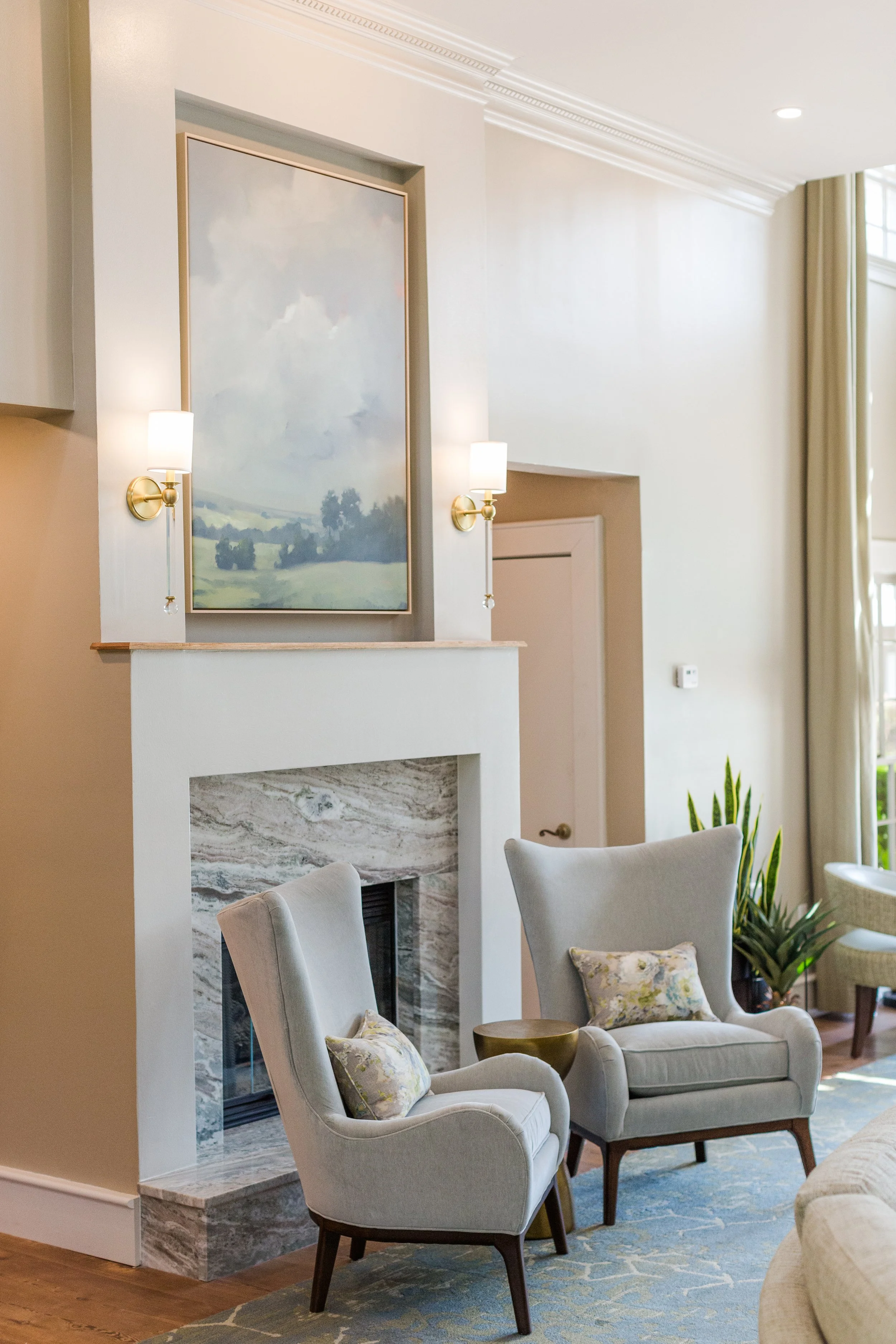 Living room with cream-colored walls, a marble fireplace, two gray armchairs with floral pillows, a blue patterned rug, a large window with curtains, and artwork above the fireplace.