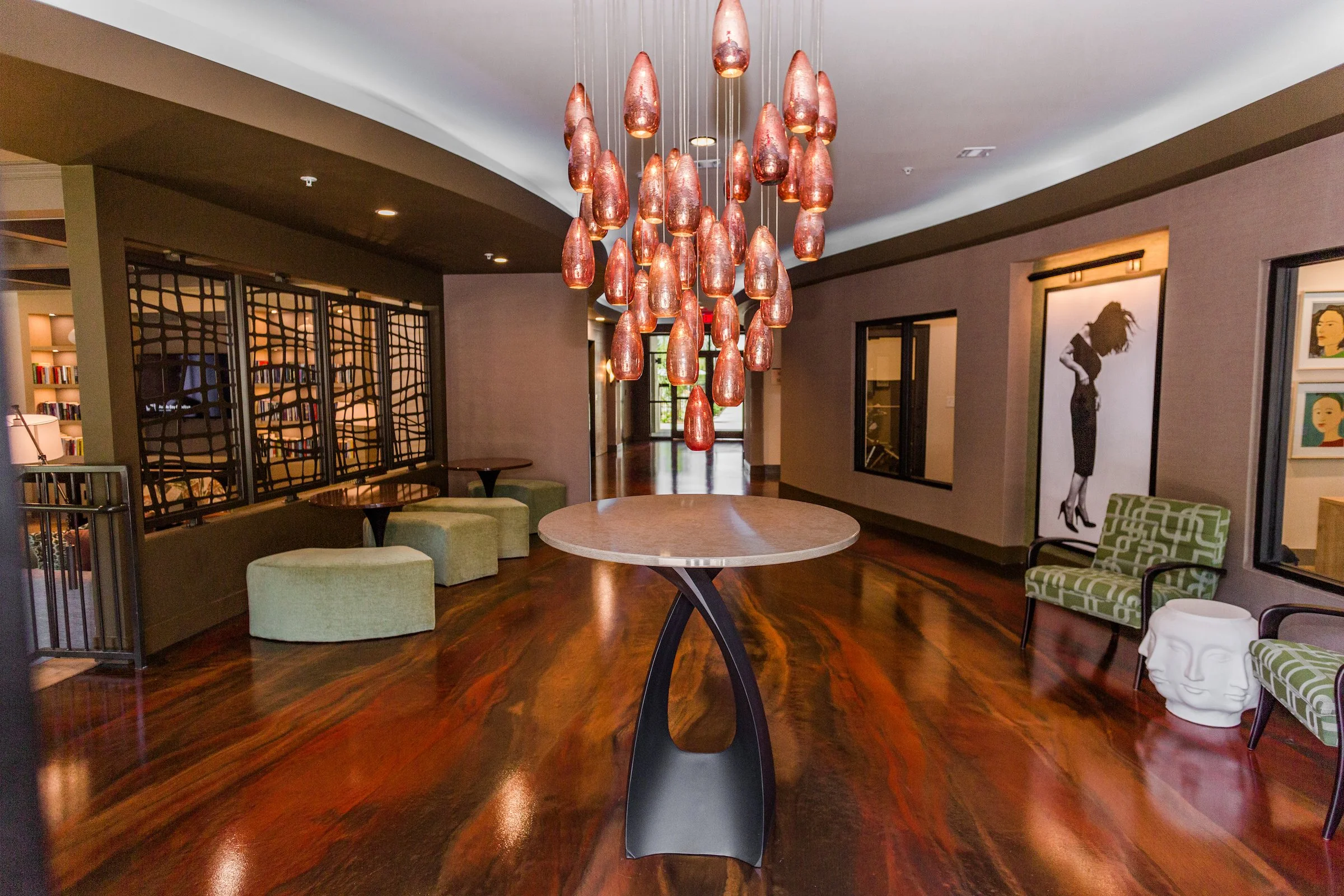 Interior of a modern lounge or lobby featuring a round table in the center, a large hanging light fixture with multiple copper-colored teardrop-shaped bulbs, green upholstered chairs, a face-shaped side table, framed artwork on the walls, and polishe