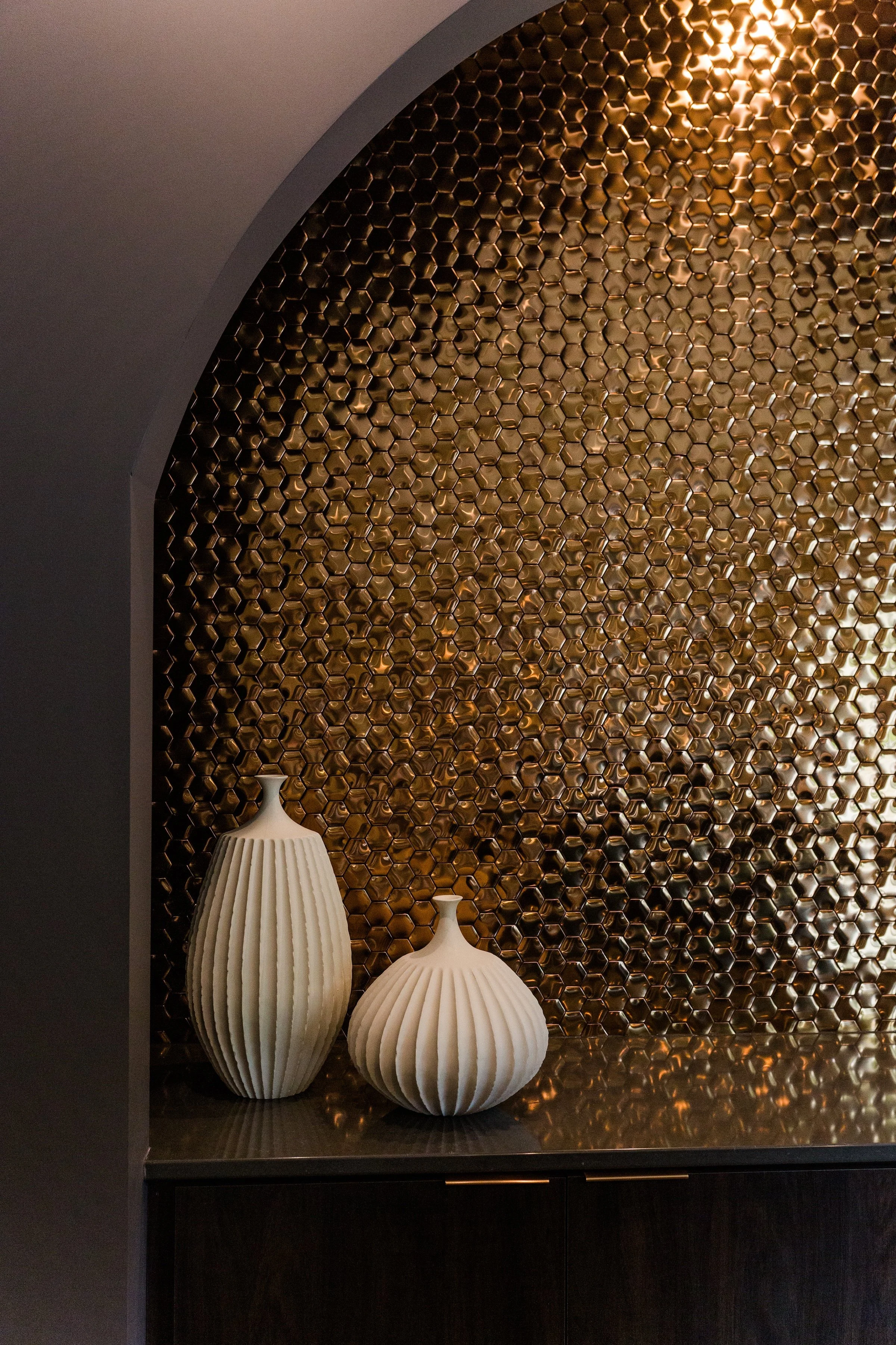 Two cream-colored, textured vases are placed on a dark surface in front of a decorative gold honeycomb-patterned wall, with an arched top, in a modern interior setting.
